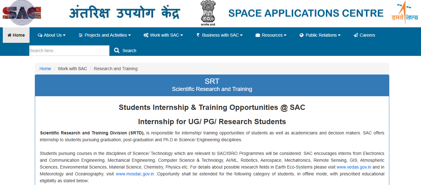 - Visit the Official ISRO Website: Go to the main ISRO site or the specific center’s site (e.g., Space Applications Centre (SAC)) and look for “Internship” or “Student Project Trainee” sections.